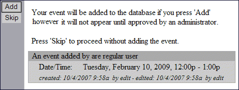 The user may add the event to the database or skip the submission. If added, the event will not appear until it is reviewed and accepted. Once made pending an event is effectively invisible to regular users. Only users with trusted edit or higher permission will be able to see the event.