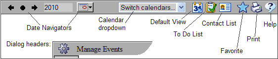 From any page you may click an icon to navigate to a certain part of the program. Other icons allow you to change the dates that you are looking at. Still other icons open this help file, adds a favorite to your web browser or prints the current page. For dialog boxes the date navigators are replaced with icons representing the dialog type and the title of the dialog.